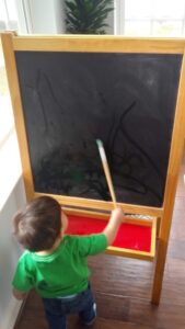 For us, setting up the independent workspace for him was imperative. We are now seeing all of the areas in our home that have been inaccessible to him – we had to hold him up to get on the toilet or wash his hands; he had no way to access food on his own; even his toys were primarily kept in a trunk that we opened when it was time to play. We are already brainstorming things we need, such as a learning tower in the kitchen, but we are also making our own solutions, such as using a step ladder in the bathroom for him to easily access the sink. This shut down has encouraged us to find new ways to use what we already have to meet our new and evolving needs for our son.
