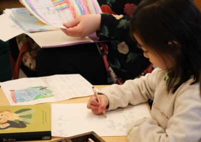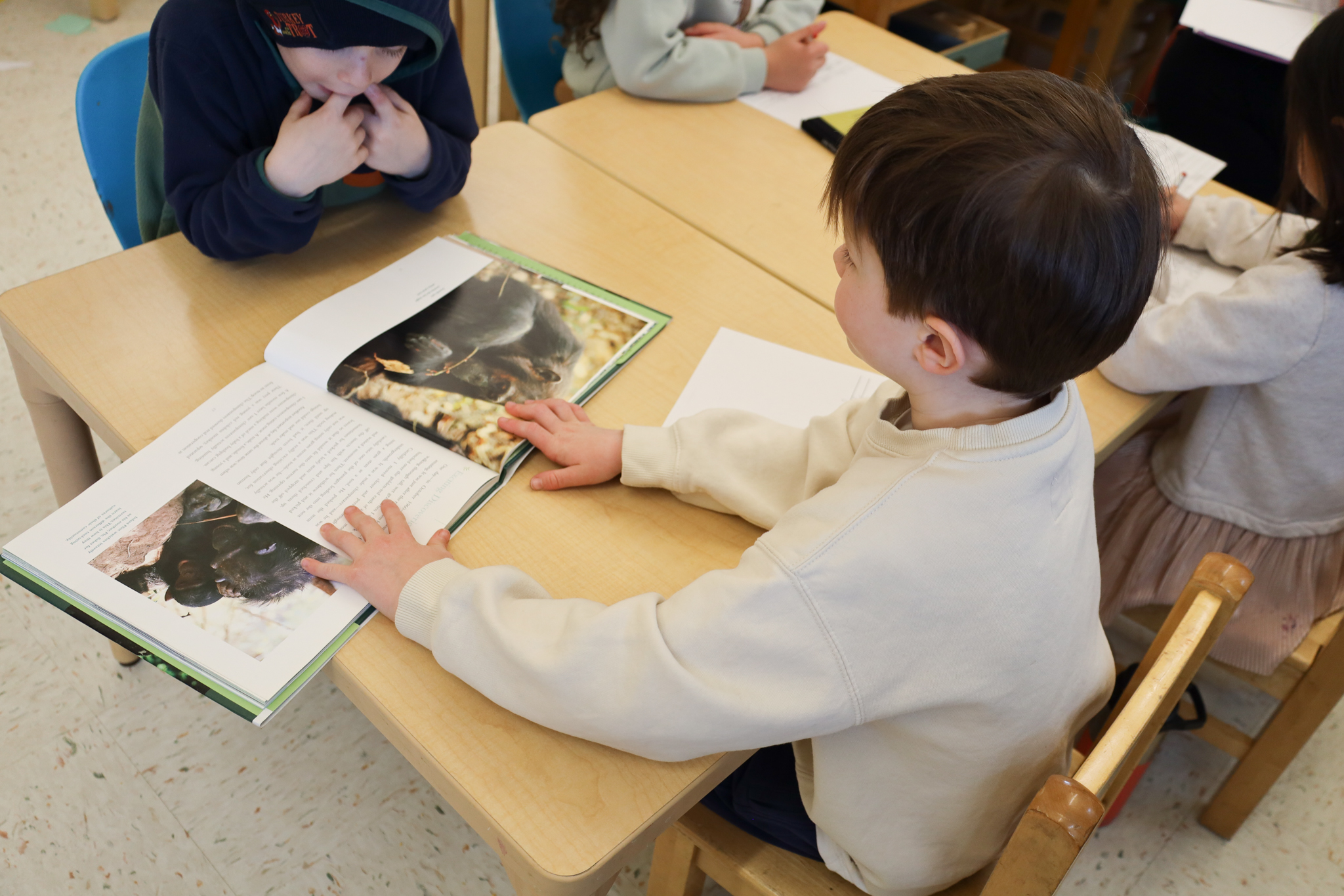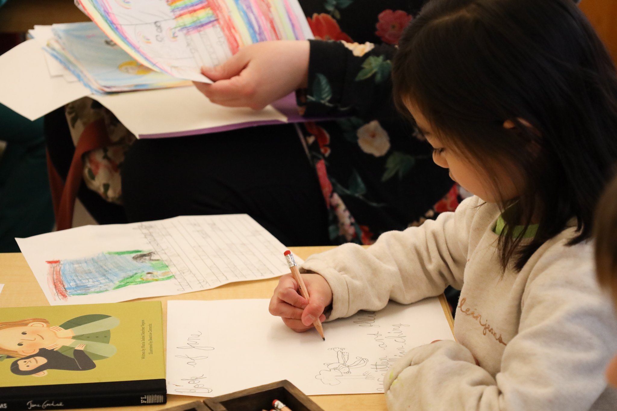 In Children’s House Writers’ Workshop, elder students (our Kindergarteners), continue to study Jane Goodall through the Roots and Shoots Program. Jane was pivotal in the study and protection of chimpanzees in Gombe, Tanzania. When she saw firsthand that the rainforest was disappearing and her beloved chimpanzees were suffering, she left Gombe and traveled the world speaking to humanity about what she has seen, sharing all of her true stories, some of tragedy but mostly true stories of hope.