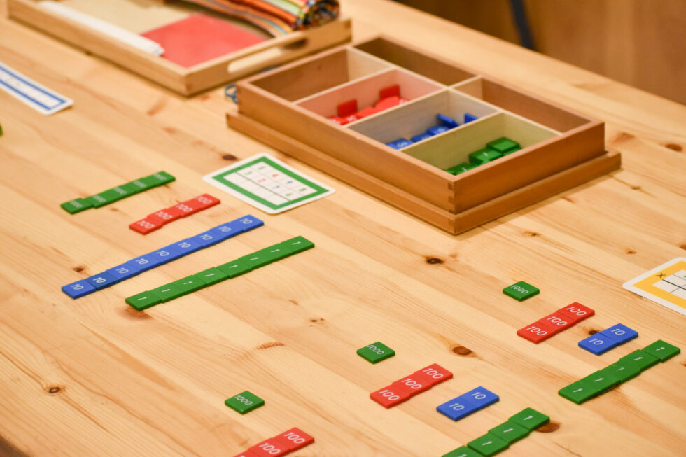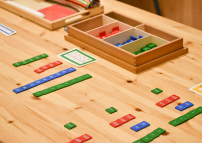 We refer to Montessori classroom spaces as prepared environments because they are carefully designed to maximize students’ independence, freedom of choice, and freedom of movement. Unlike traditional classrooms that often use bright colors, posters, and decorations to try and excite children, Montessori classrooms are organized and uncluttered, featuring simple décor such as plants and framed artwork. The environment is calming and draws attention to the beautiful hands-on materials, which are designed to entice the students to engage with them. Everything in the classroom is for the students’ use. You will not see a teacher’s desk or things mounted at adult eye level on the walls. Instead, the room features low, open shelving full of hands-on materials for students’ use. Because Elementary students are more social and often motivated by working with peers, open floor space and group tables support collaborative work.