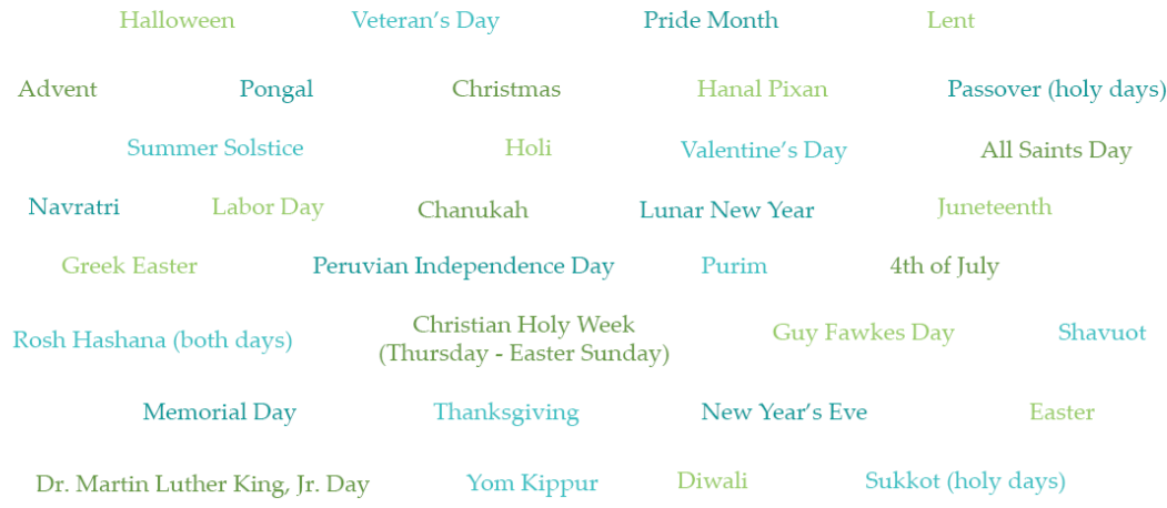 This year, the Diversity, Equity, Inclusion, and Belonging (DEIB) Committee had an ambitious goal of creating lessons and resources for global holidays and cultural celebrations. The Committee strives to create thoughtful and authentic resources for our Guides without a tokenistic or “tourist” approach to exploring diversity with children. To do this, the Committee spoke to the faculty and staff about the holidays they celebrate at home and what aspects are most important to them. Below is a word cloud of all of the holidays celebrated by the faculty and staff at Greenspring. The staff was excited to see the many ways in which our community celebrates, and they were then invited to share with our students the special aspects of the holidays they celebrate at home.