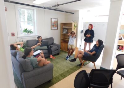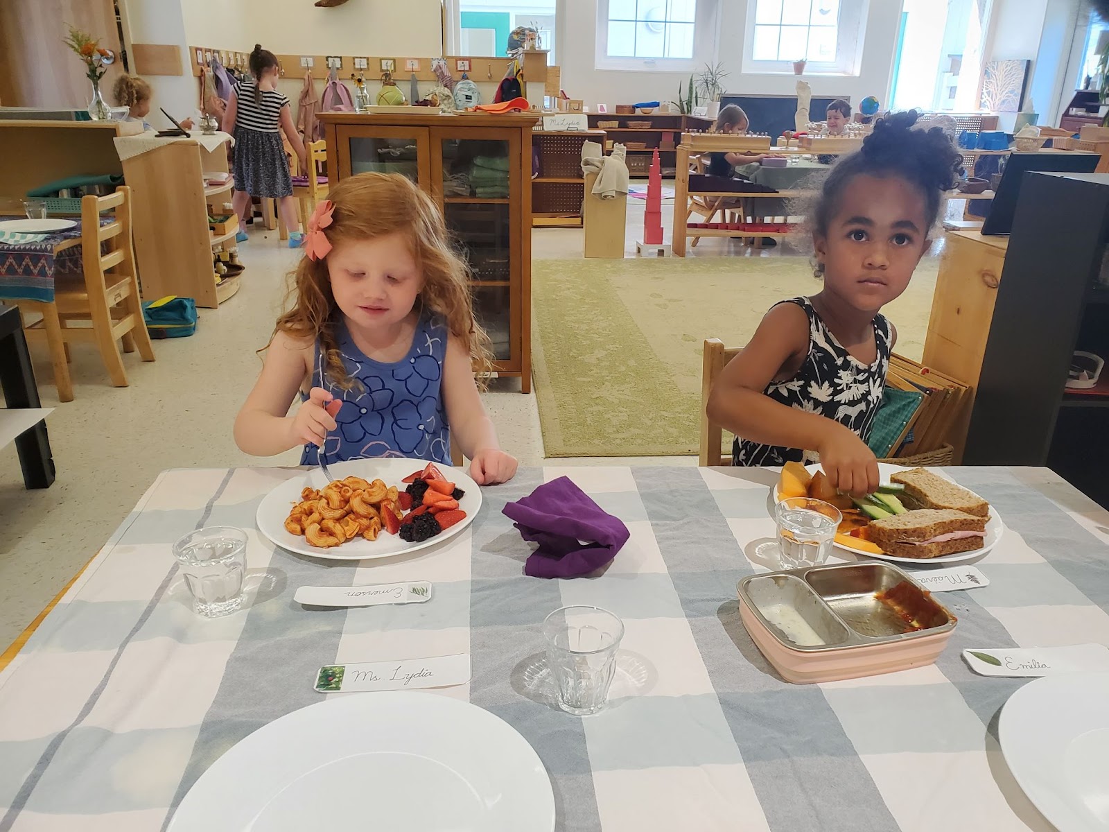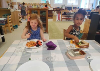 During the meal, students have the opportunity to practice the Grace and Courtesy skills they have learned. For example, the children practice table manners, such as starting the meal together once everyone is seated, putting napkins on their laps, using utensils properly, chewing with their mouths closed, and excusing themselves from the table. They also practice conversational skills, such as taking turns speaking and asking each other questions.
