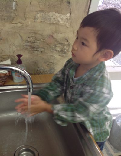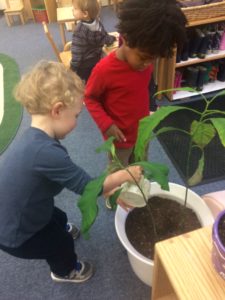 Lessons on respecting the environment include carrying and rolling up a rug, setting the table, how to take materials off of shelves, washing a plant, washing a table or mirror, etc. We are working daily on cultivating a sense of gratitude and nurturing wonder.