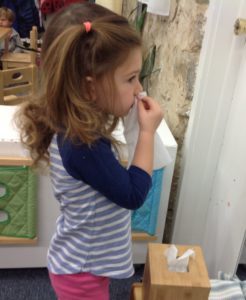 There are specific Grace and Courtesy lessons that demonstrate how to respect and care for oneself, such as blowing one’s nose, washing hands, getting in and out of a chair, putting on shoes, hanging up or putting on a jacket, etc.