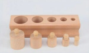 What it is: A wooden block containing a set of five cylinders with knobs, each varying systematicallyin one dimension (such as diameter or height). The child removes the cylinders and replaces them into their corresponding sockets, often working with one block at a time to isolate a single quality.