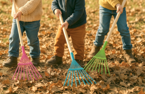 What it is: A child-sized rake and a designated outdoor area with leaves. The child is shown how togather leaves into a pile using controlled, purposeful movements, and may then transfer them to a wheelbarrow or compost area.