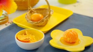 What it is: A small tray with a clementine, a small bowl for peels, and a plate. The child is shown how to hold the fruit, peel the skin using their fingers, separate the segments, and place the peels into the bowl before enjoying or serving the fruit.